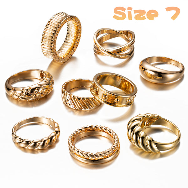 • Chunky Rings Set: You will receive 9pcs fashion gold chunky rings in 9 different style, all of them are size7. Each ring can surprise you, they can be worn by men and women of all ages. You can choose one or more of them to wear as you like . Don't miss such a great value ring set!